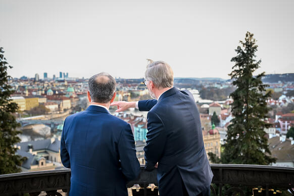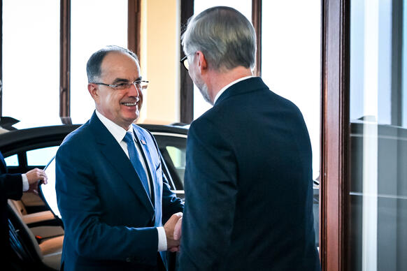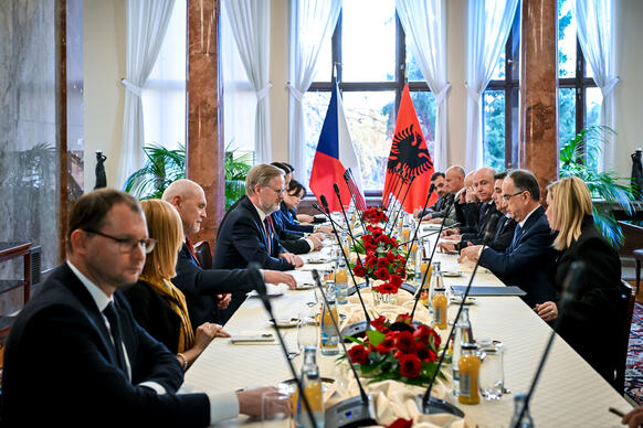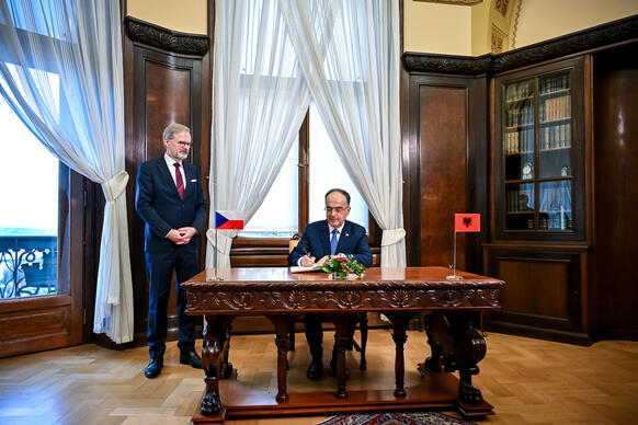 Předseda vlády v demisi Petr Fiala se ve středu 19. listopadu 2025 v Kramářově vile setkal s prezidentem Albánské republiky Bajramem Begajem. Hlavními tématy jednání byla aktuální mezinárodní situace, průběh přístupových jednání Albánie o vstupu do Evropské unie a hospodářská spolupráce. Premiér ocenil dynamický rozvoj česko-albánských vztahů i roli Albánie při posilování stability na západním Balkáně.