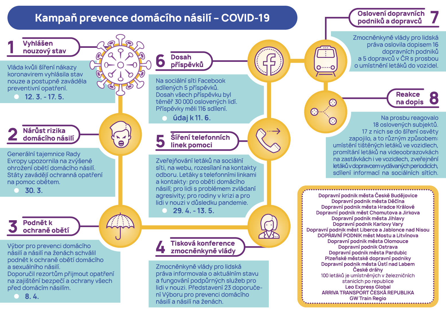 - Odbor rovnosti žen a mužů Úřadu vlády oslovil dopravní podniky a soukromé dopravce s žádostí o výlep plakátů s telefonními linkami pomoci obětem domácího násilí. Vylepilo se více než 1 700 letáků v prostředcích městské hromadné dopravy, dopravních prostředcích na meziměstských linkách, autobusových a vlakových nádražích.