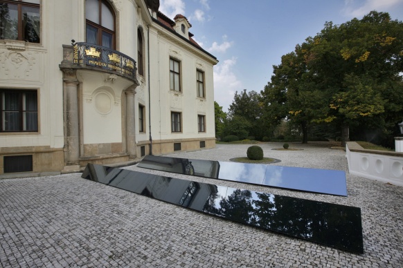 Průčelí vily směrem na Prahu Václav Cigler + Michal Motyčka: Kompozice dvou reflexních hranolů - 2009, pokovené tabulové sklo, kov, 2,8 × 8 × 0,5 m