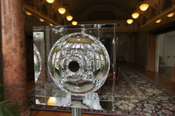 Jídelna Václav Cigler: Průzor - návrh 70. léta, realizace 2008, optické sklo, pokovení, nerezový sokl, sklo 25×25 cm